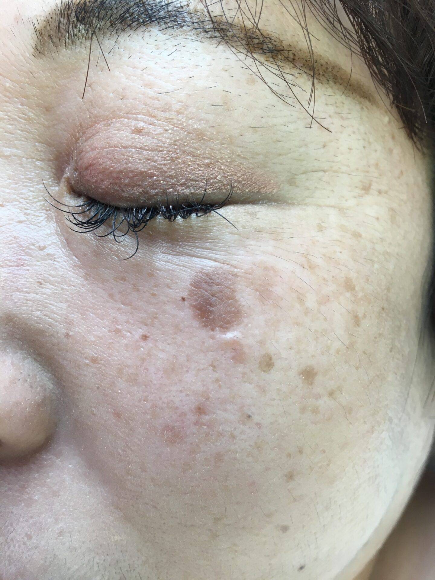 左頬に15ミリ大のシミがあり、お化粧しても隠れないし、老けて見えるからどうしたらいいの?とのご相談でした。