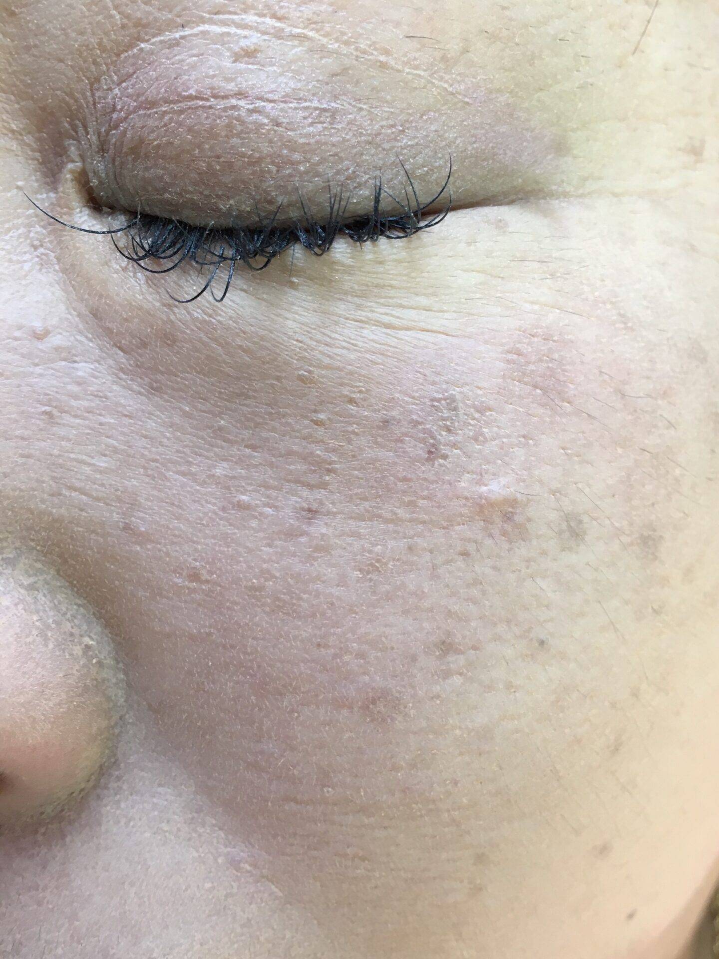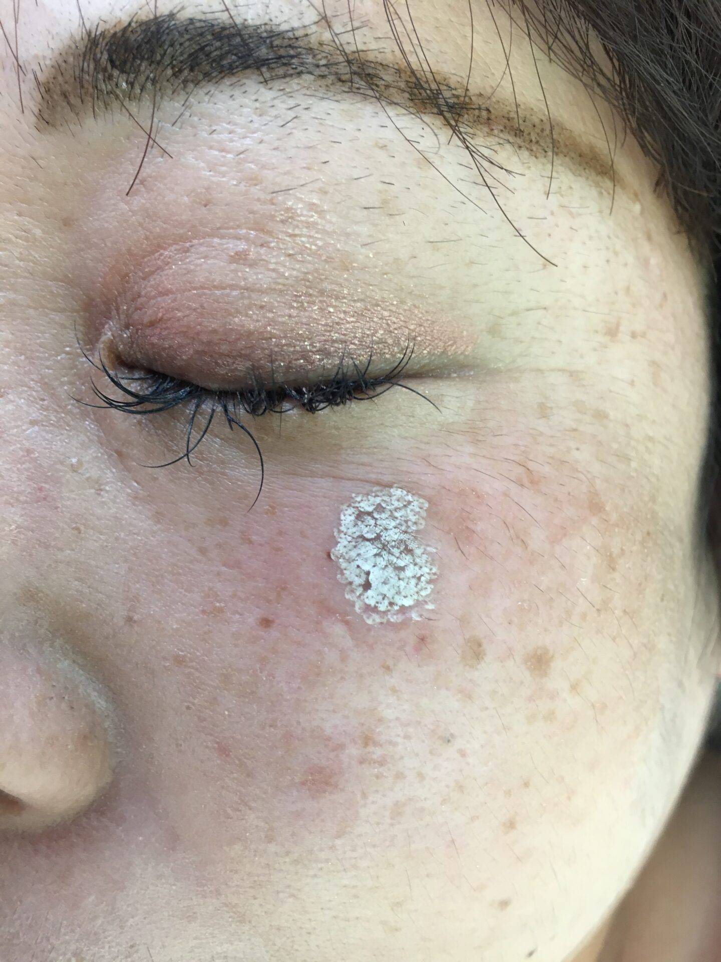 まだ赤みがありますね。外用テープ処置を続けてもらい、2週間後にDrにチェックしてもらい翌日からお化粧しても良いと。