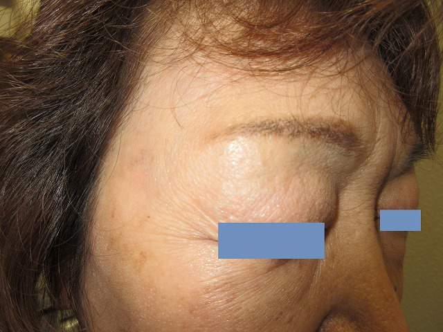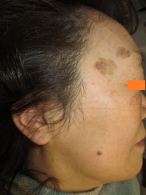【シミ治療】レーザー照射により、メラニン色素を減少または消失させる。起こりうる合併症(リスク)と時期:術後1週間前後、痂疲、びらん。二次感染のリスク。上皮化後、赤みが1から数か月。1回の治療でシミが完全になくなる保証がない。元々ある左右差や望ましくない状態の残存。