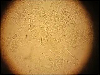 ↑上は実際に患者さんの皮膚から見つけたDemodexです。