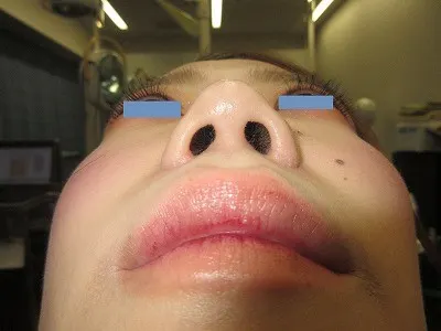 術前の下からの写真では、左の鼻孔及び鼻翼が大きく見えます。