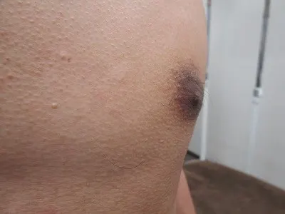 アトピー性皮膚炎による掻き破りの繰り返しにより乳頭肥大をきたしていました。