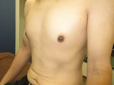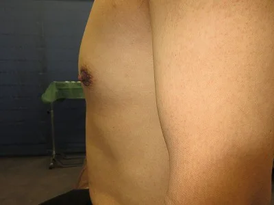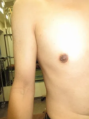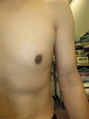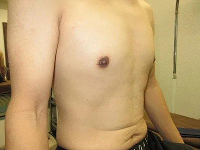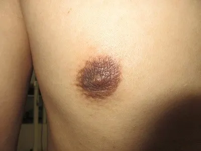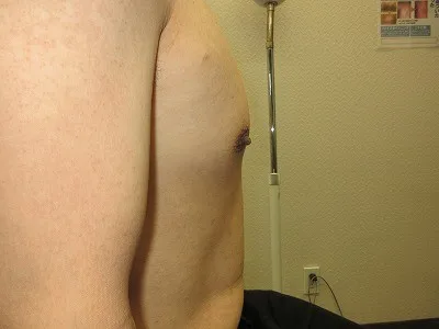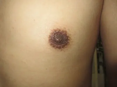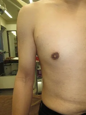 【乳頭縮小術】乳頭の皮膚を切除し、乳頭の大きさを縮小する。起こりうる合併症(リスク)と時期:術後1から2週間は腫れ、内出血、血腫、二次感染。術後1から3か月は浮腫。術後3から6か月は傷の硬さ赤み、元々ある左右差や望ましくない状態の残存。
