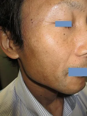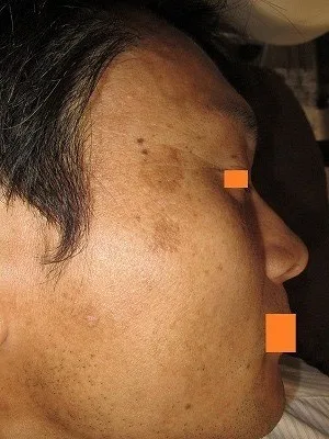 【シミ治療】レーザー照射によりシミの脱落を図る。起こりうる合併症(リスク)と時期:術後1週間前後、痂疲、びらん。二次感染のリスク。上皮化後、赤みが1から数か月。1回の治療でシミが完全になくなる保証がない。元々ある左右差や望ましくない状態の残存。