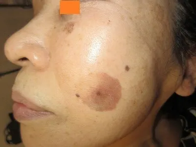 【シミ治療】レーザー照射によりシミの脱落を図る。起こりうる合併症(リスク)と時期:術後1週間前後、痂疲、びらん。二次感染のリスク。上皮化後、赤みが1から数か月。1回の治療でシミが完全になくなる保証がない。元々ある左右差や望ましくない状態の残存。