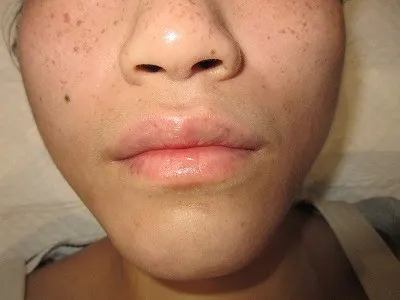 両頬を中心に半米粒大の褐色斑が多発しています。