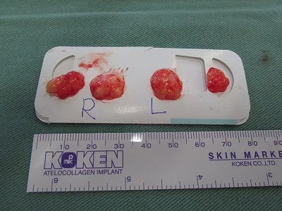 ↑摘出した眼窩脂肪。※右中央の眼窩脂肪を意図的に多めに採っています。