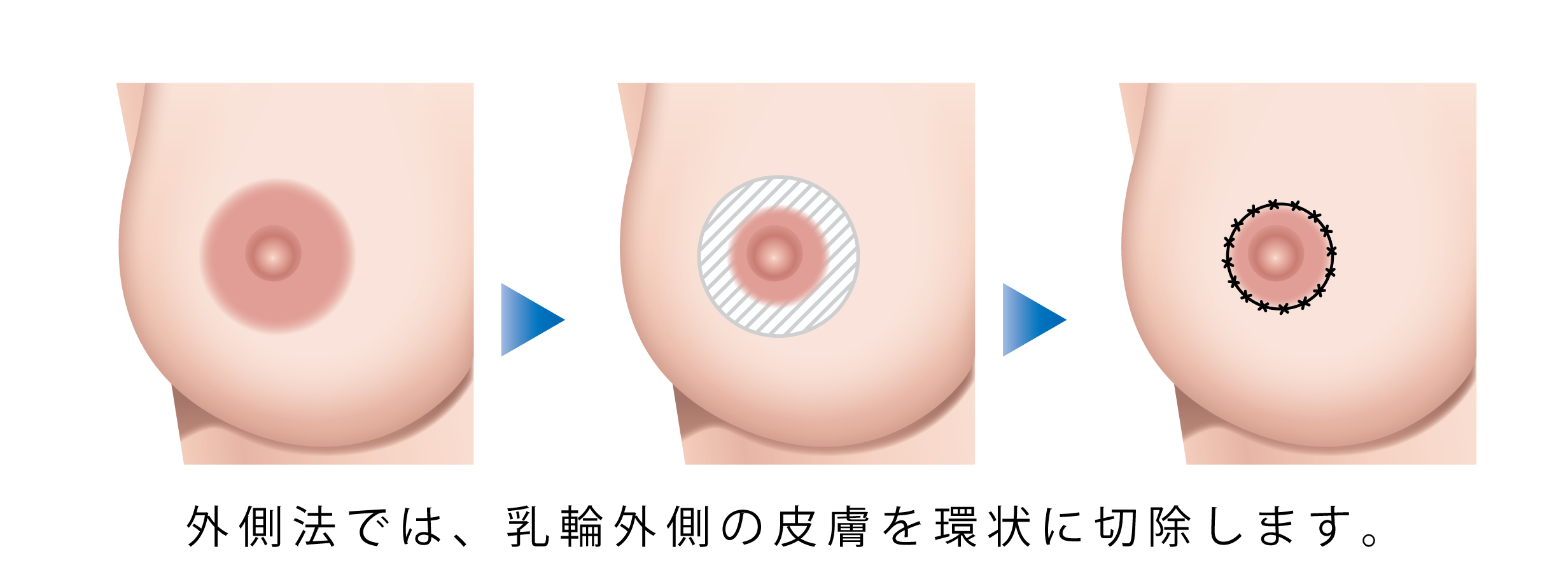 ・乳輪の外周を環状(ドーナツ状)に切除し、巾着袋のように縫合をかける外側法