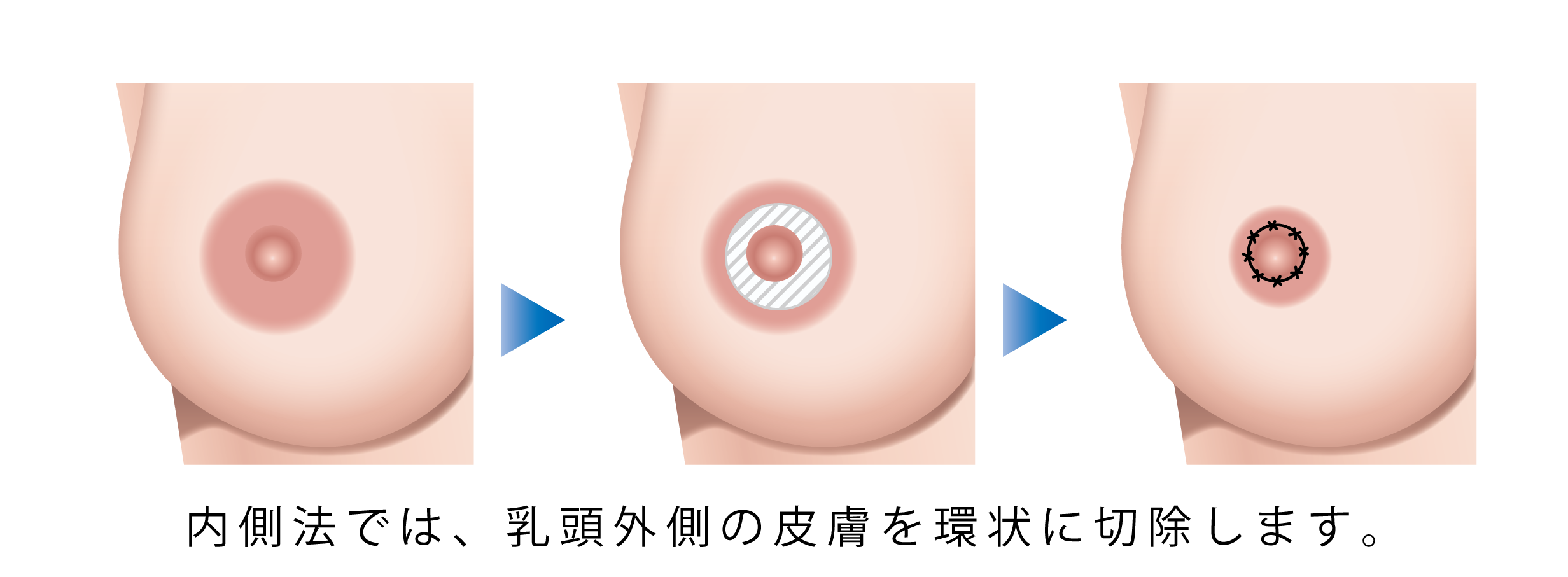 ・乳頭の外周を環状(ドーナツ状)に切除し、巾着袋のように縫合をかける内側法