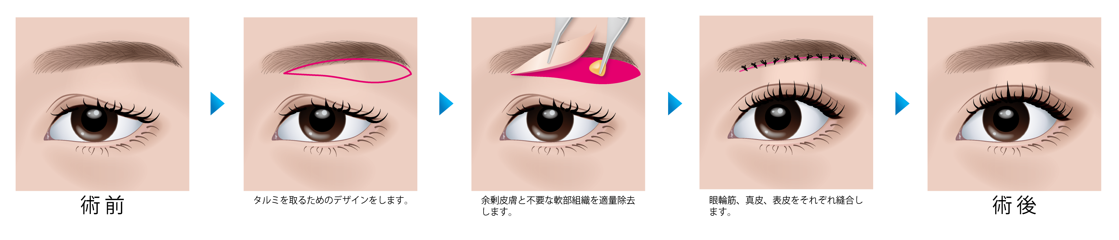 余剰皮膚を切除した上で、まぶたをリフトアップします。