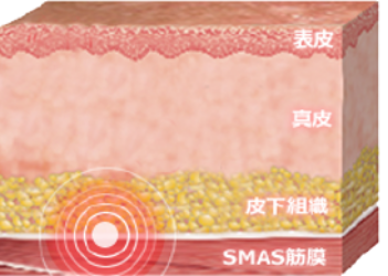 レーザーは真皮層まで、高周波(RF)は脂肪層の深さまで、エネルギーを届けることができますが、HIFUによる熱エネルギーはSMAS筋膜まで到達します。