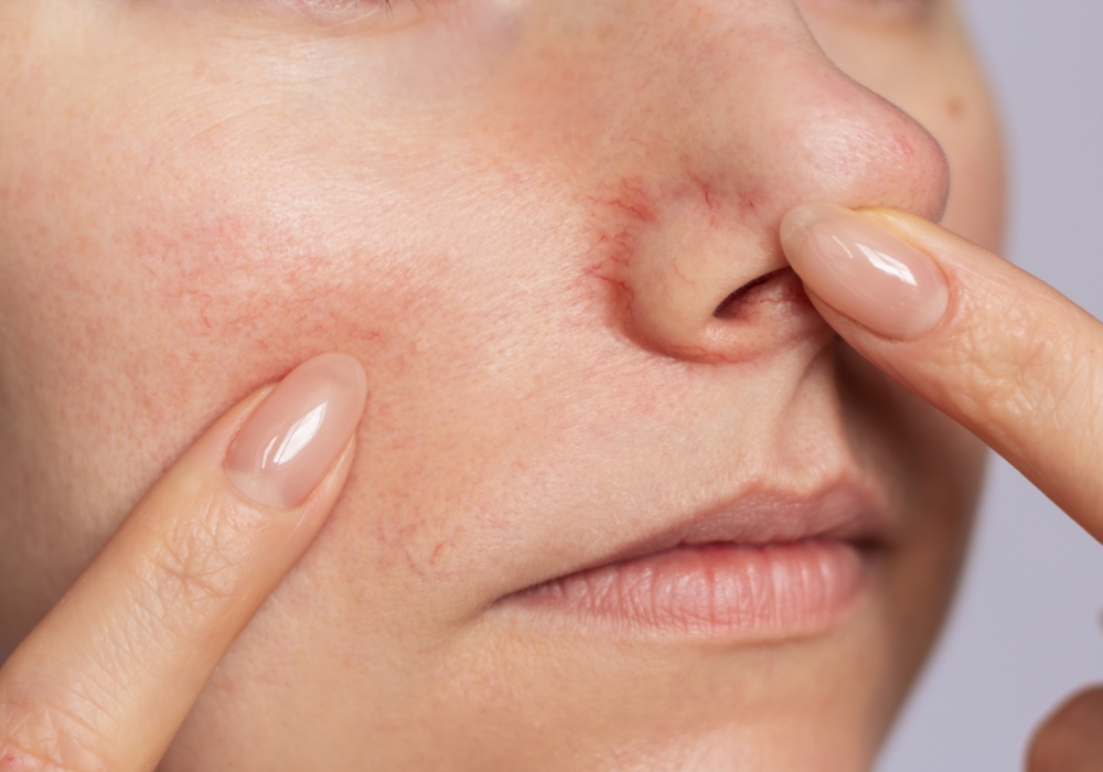 酒さや毛細血管拡張症では、顔の表面の血管が拡張することで赤ら顔となっています。